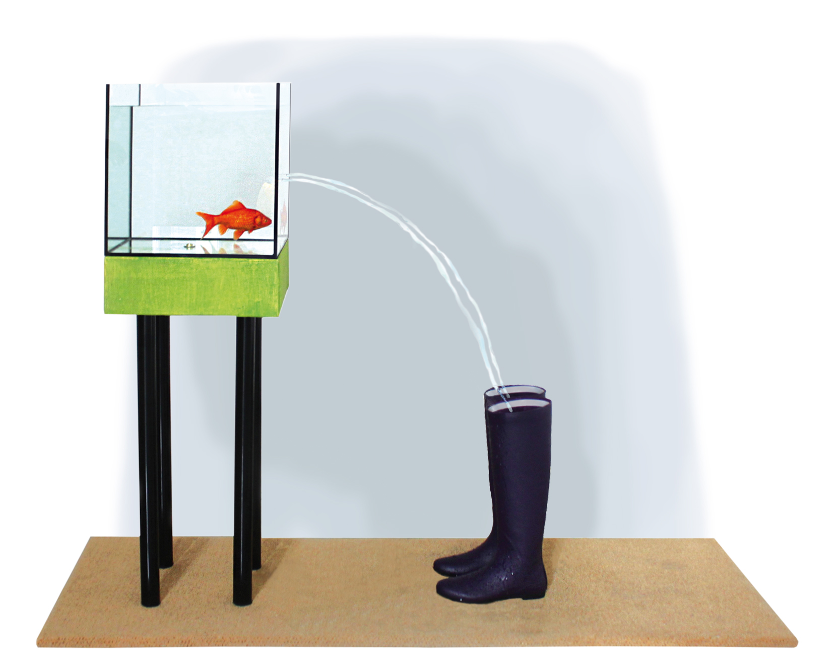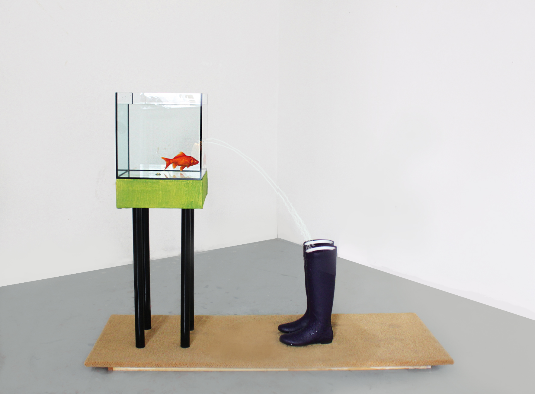 Jako téma bakalářské práce jsem si zvolila Prekérní situace. Objekt je zkonstruovaný tak, že v akváriu s rybkou jsou dvě díry, jimiž vytéká voda do vyztužených gumáků. Z bot je pak voda čerpána zpět do akvária pomocí čerpadla a hadice vedené nohou soklu.